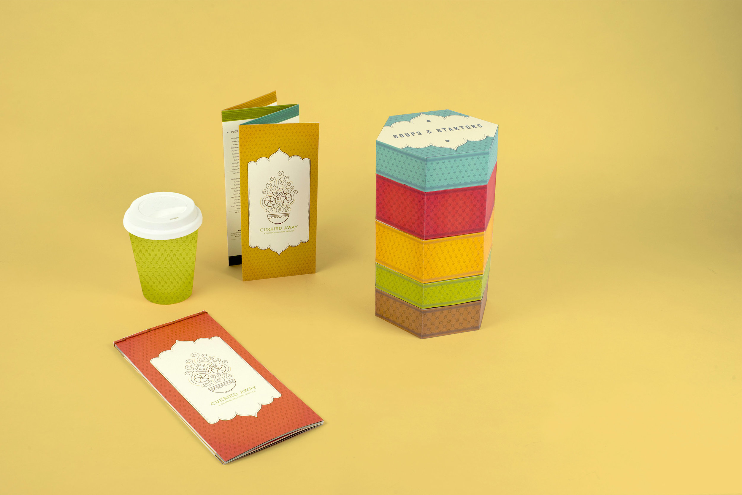 Curried Away is a branding package for an Indian restaurant, with a demographic focused on 74% of the American public burdened with dietary issues. Their mission is to help ease the hassle of making gut-friendly work lunches and provide a quick fix for last-minute healthy meal options. Curried Away takes a lot of inspiration not only from India’s rich culture but from a long tradition of the Dabbawalla men--a group of workers that deliver fresh food in tiffin containers to people during their working lunch hour. The branding alludes to the delivery bikes and India’s beautiful fabrics, while packaging presents the tiffin container in a modern form.