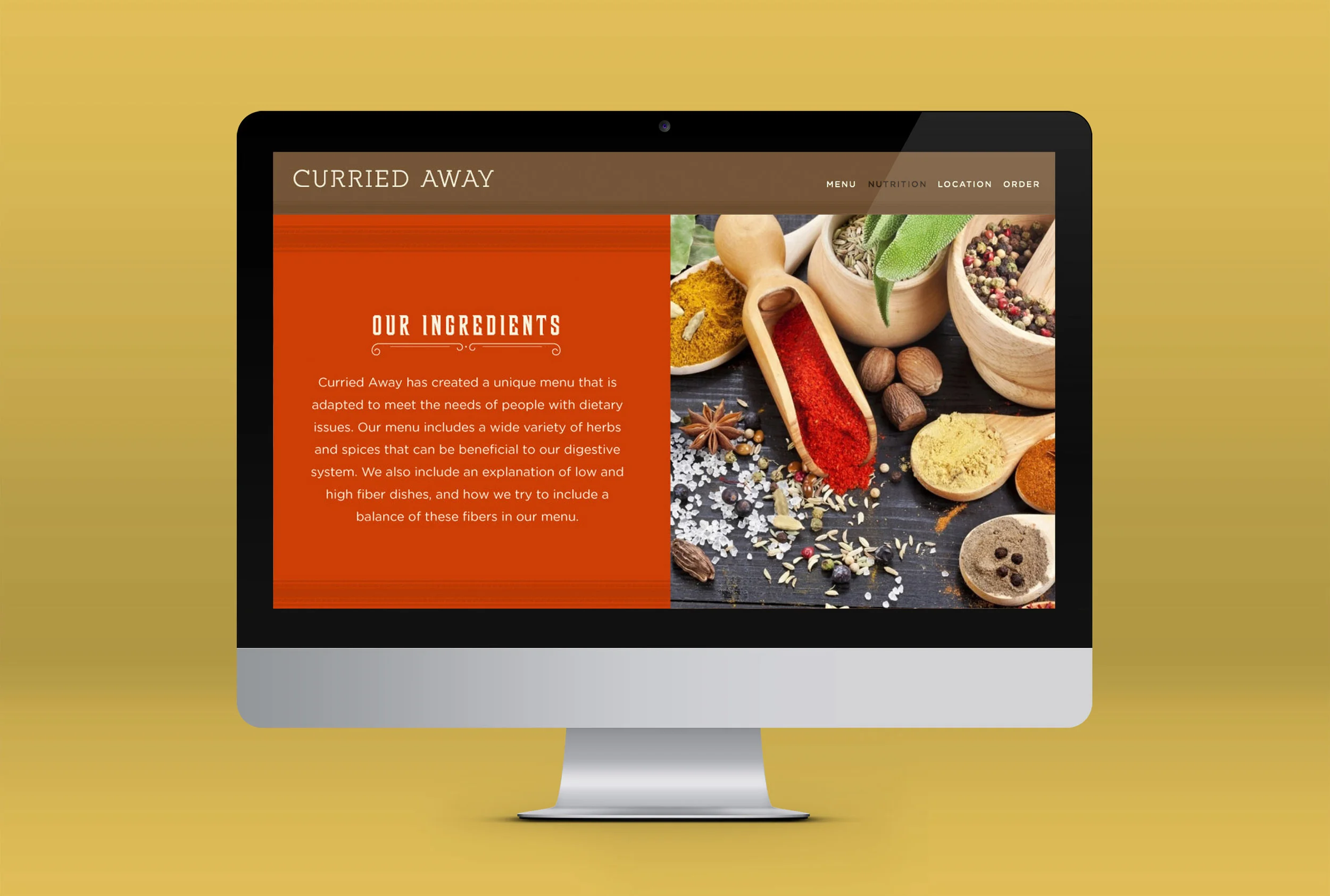 Curried Away's website and mobile application are a huge part of this brand. The company relies heavily on it's to-go services, so having their full menu online and an easily accessible app were must-haves. Along with the full menu, the website includes a nutrition section that helps educate it's customers on the ingredients that Curried Away uses, as well as what to eat depending on certain dietary restrictions.